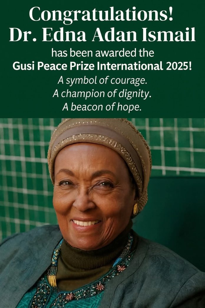 Dr. Edna Aadan Ismaaciil ayaa la guddoon-siiyey abaal-marinta caalamiga ah ee Gusi Peace Prize International 2025, taas oo lagu maamuuso shaqsiyaadka dunida ku soo kordhiya waxyaabaha waxtarka u leh bulshada ee adeegyada caafimaadka iyo adeegyada bani’aadannimo ee muuqda.